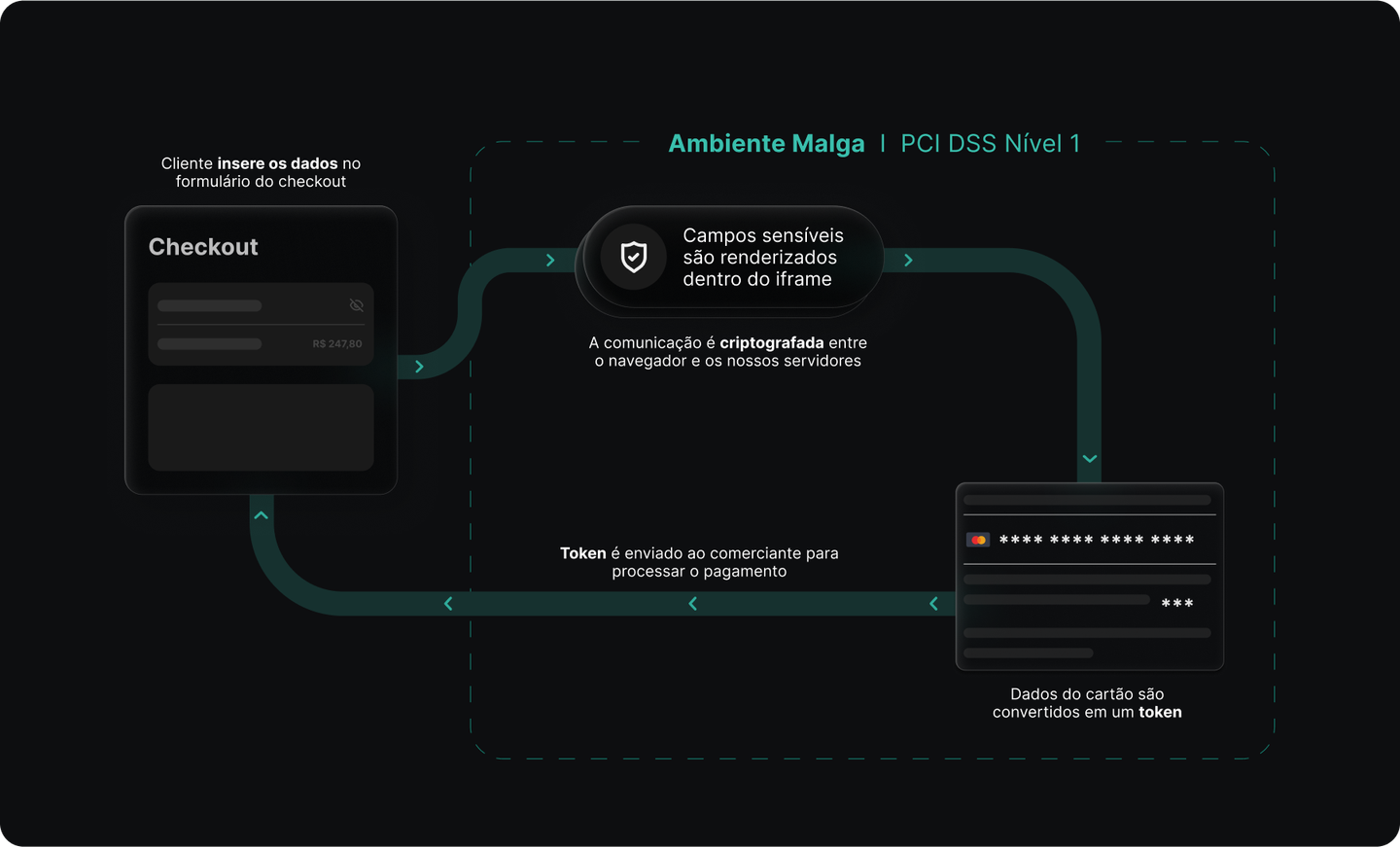 Os Hosted Fields são campos de entrada (inputs) encapsulados dentro de iframes seguros, garantindo que dados sensíveis, como números de cartão, nunca sejam expostos diretamente ao navegador ou ao front-end da aplicação. O SDK utiliza nossa aplicação de Hosted Fields que permite que a coleta de dados do cartão ocorra em um ambiente compatível com PCI DSS Level I. Sendo o Hosted Fields o responsável por criar e adicionar os inputs na tela, garantindo total conformidade com os padrões de segurança.