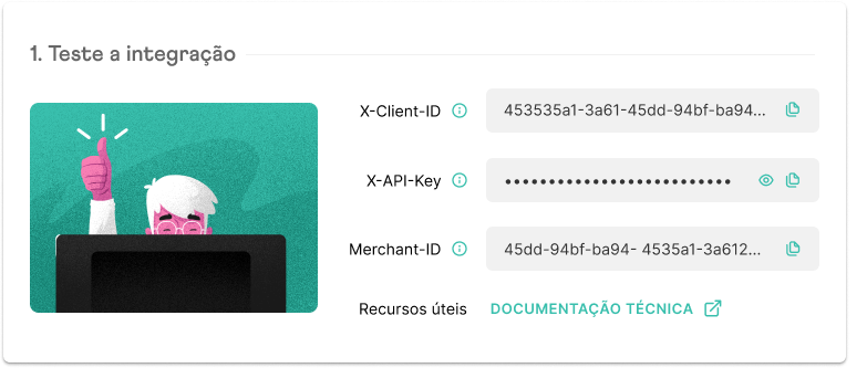 Antes de começar, certifique-se de que possui as chaves de integração (X-Client-ID e X-API-Key) para ambiente de sandbox. Caso ainda não tenha, basta criar uma conta em nosso Dashboard para obter suas credenciais.